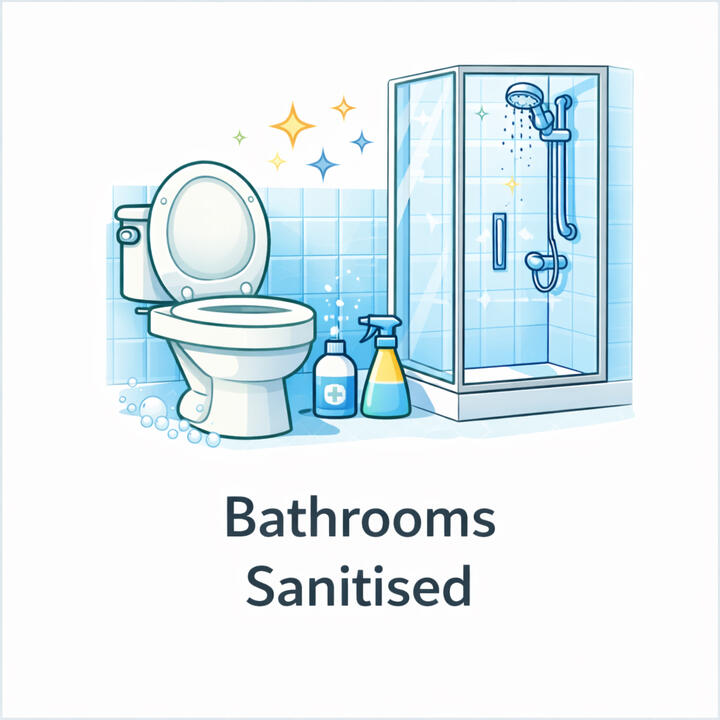 Toilets, showers, sinks & tiles sanitised.